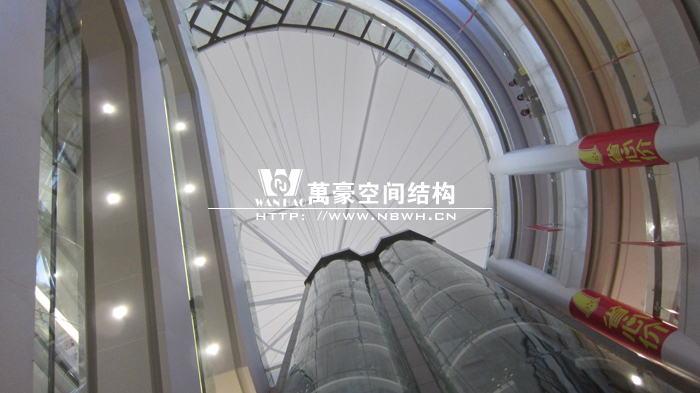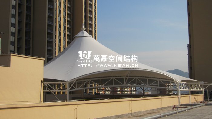 本工程總建筑面積約900平方米,主體一根主柱、九根支柱,四周單片桁架連接,總體一個(gè)帽柱,直線長(zhǎng)為26.9米,帽柱總高33.6米,寬為27.8米。因?yàn)楸竟こ套湓谏虡I(yè)區(qū)中心,四周都是五層商鋪,吊車無法進(jìn)入施工現(xiàn)場(chǎng),先用25噸吊車把材料送到五層樓房頂,后用人工或手拉葫蘆進(jìn)行運(yùn)送和安裝。施工范圍包括鋼結(jié)構(gòu)系統(tǒng)與膜材系統(tǒng)的制作和現(xiàn)場(chǎng)安裝施工,現(xiàn)工程已經(jīng)完工。