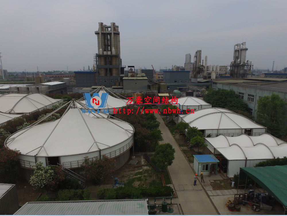 東廠區(qū)生化池膜結(jié)構(gòu)加蓋工程,坐落于浙江省紹興市杭州灣上虞經(jīng)濟(jì)開發(fā)區(qū)龍盛科技園內(nèi)。整個(gè)項(xiàng)目由A/O池加蓋4座、二沉池加固定蓋4座、濃縮池加蓋2座、氧化池加蓋1座、氧化氣浮池加蓋1座、氧化集水池加蓋1座、出水調(diào)節(jié)池1座、安諾池1座,共計(jì)15座鋼膜結(jié)構(gòu)組成??傆娩摿窟_(dá)350噸,膜結(jié)構(gòu)展開面積達(dá)35000平方米。