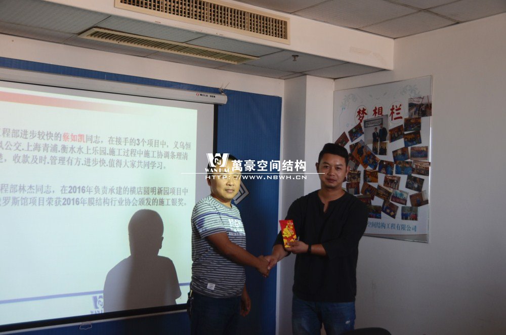 2017年7月,在工程部經(jīng)理的組織帶領(lǐng)下,公司工程部成功舉辦年中總結(jié)計(jì)劃會(huì)議,工程部經(jīng)理對(duì)上半年的工作做了總結(jié),也提出了下半年的工作計(jì)劃,得到張總的認(rèn)可,會(huì)議最后著重表揚(yáng)了工程部蔡如凱同志和林杰同志。