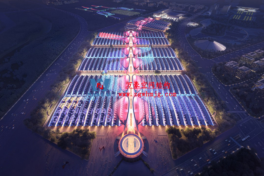 鄭州中原高鐵港數(shù)字展貿(mào)城項(xiàng)目坐落于鄭州航空港經(jīng)濟(jì)綜合實(shí)驗(yàn)區(qū)中原國(guó)際會(huì)展中心二期,總占地面積2450畝,規(guī)劃總建筑面積為52.74萬(wàn)平方米。主體結(jié)構(gòu)將由多個(gè)大型鋼構(gòu)支撐,可承受巨大的荷載。整個(gè)建筑外立面及部分屋頂將覆蓋 ETFE 氣枕膜,其余部分將覆蓋PTFE膜,打造出通透、現(xiàn)代的建筑外觀。該項(xiàng)目用鋼量超10萬(wàn)噸,ETFE膜屋面超3萬(wàn)平方米,PTFE膜屋面超10萬(wàn)平方米。