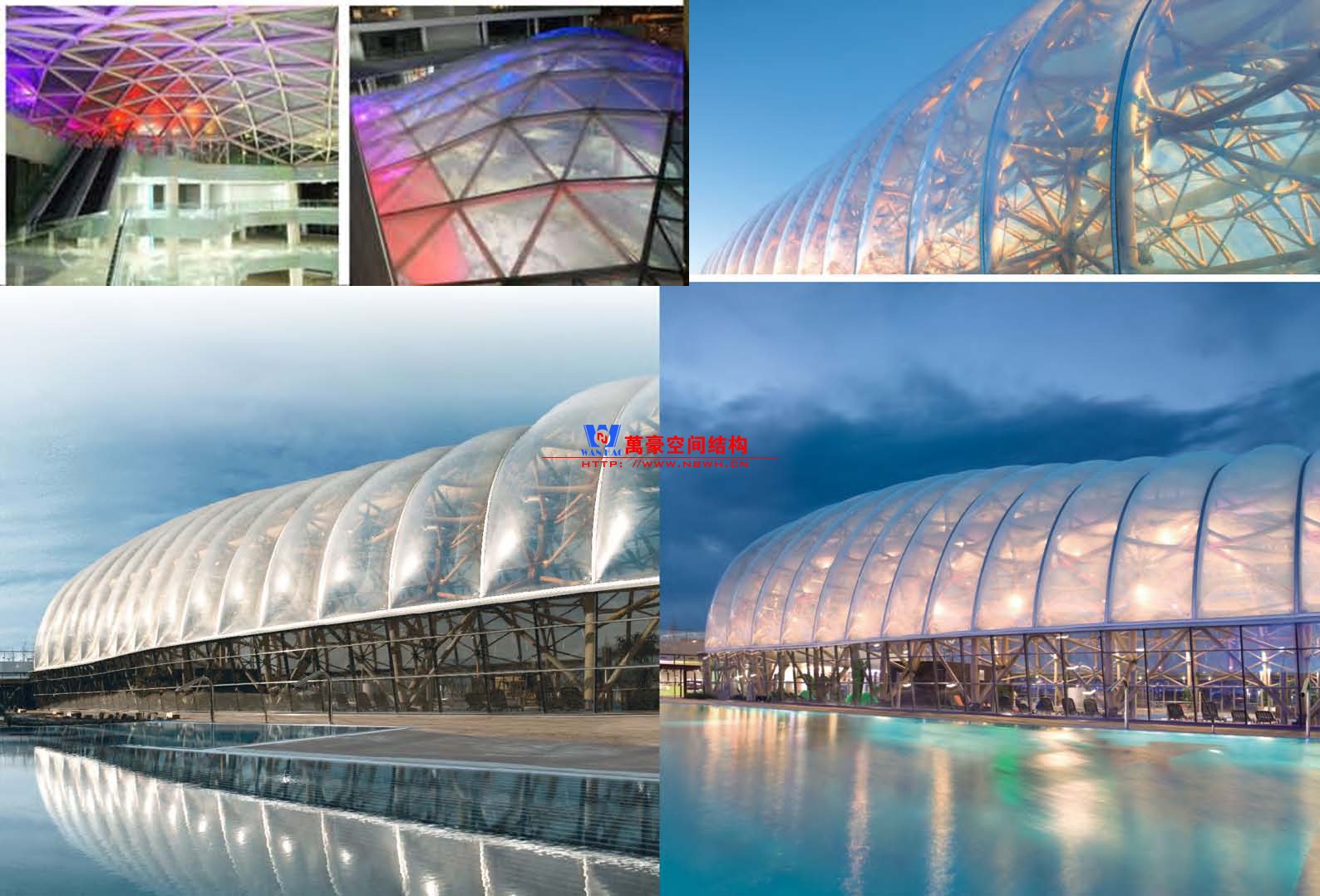1. 骨架式膜結(jié)構(gòu):此類(lèi)膜結(jié)構(gòu)是固定在精致鋼材、空間桁架或其他堅(jiān)固的構(gòu)架上,稱(chēng)之為骨架式膜結(jié)構(gòu)。