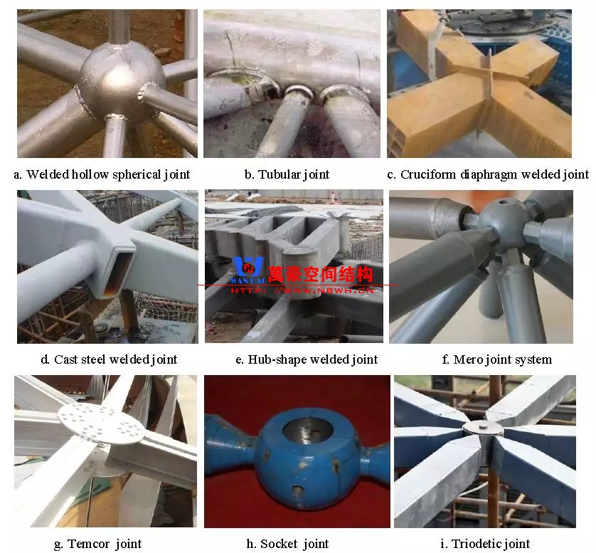 羅馬尼亞布加勒斯特穹頂1961年建成,跨度約93.6米,矢跨比約1:5。鋼管桿件構(gòu)成的單層網(wǎng)殼,網(wǎng)格呈等邊三角形式,支承在沿圓形周邊布置的混凝土柱上。在網(wǎng)格的節(jié)點處有三個方向鋼管匯交,如何連接?
