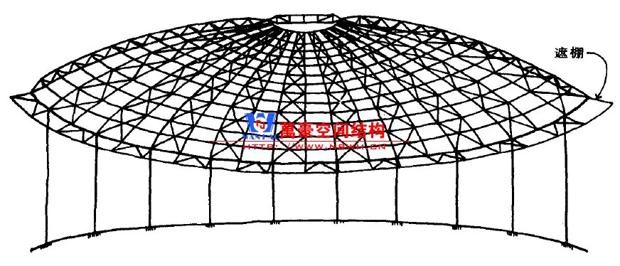 查爾斯.威廉郵政學院(CharlesWilliam Post College)于1970年建造了一個劇院。屋面采用鋼結(jié)構(gòu)穹頂,穹頂直徑約52米,由環(huán)繞于四周的鋼柱支承,鋼柱間沿經(jīng)線均勻布置四十榀鋼管桁架。穹頂頂部設鋼壓力環(huán),底部采用圓形的雨棚作為拉力環(huán)。緯向每隔一格布置連續(xù)十字交叉支撐。