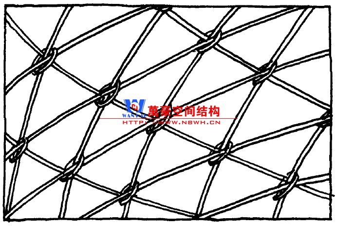 施萊希采用了四邊形網(wǎng)格劃分的球殼。網(wǎng)格桿件承擔軸力,增設拉索拉結(jié)對角節(jié)點,保證四邊形網(wǎng)格的穩(wěn)定性。