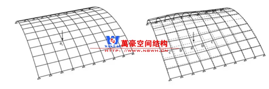 網(wǎng)殼受力方式為薄膜作用,屬于拱結(jié)構(gòu)向三維的拓展;因此,與拱類似的問題會出現(xiàn)在網(wǎng)殼上。比如:整體穩(wěn)定問題;不對稱荷載敏感等。