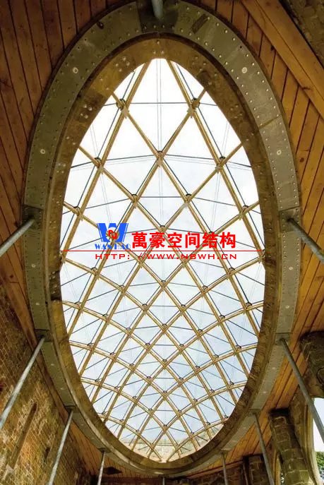 這是一個古老的鑄鐵網(wǎng)殼,建于19世紀后期。可以看出,這個網(wǎng)殼沒有斜桿,它是利用桿件的抗彎能力來抵抗平面的扭轉(zhuǎn)。