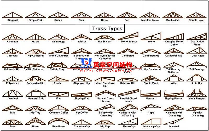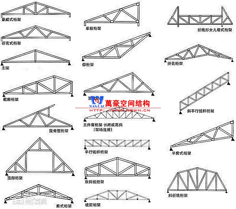 單柱式和雙柱式屋架在相當(dāng)漫長的歷史中并沒有太大變化。直到19世紀(jì)中葉,各種現(xiàn)代桁架形式相繼出現(xiàn),比如豪威桁架(Howe)、芬克桁架(Fink)、華倫桁架(Warren)、普拉特桁架(Pratt)等。桁架材料也不再局限于木材,越來越多的采用了鐵或鋼。