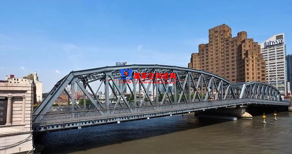 位于上海的外白渡橋是中國的第一座全鋼結(jié)構(gòu)鉚接橋梁,于1908年1月20日落成通車。該橋?yàn)橄鲁惺胶喼т撹旒?,兩孔跨?jīng)組合各52.12米,橋面鋪設(shè)電車軌道。