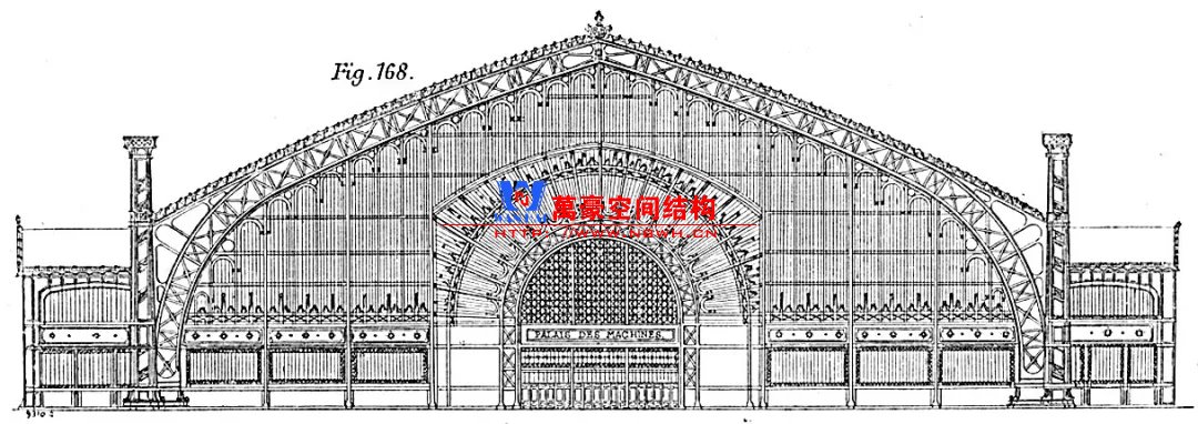 巴黎世博會機(jī)械館由工程師J·B.Krantz和埃菲爾Eifel設(shè)計,于1867年建成。它采用鋼制三鉸拱,拱截面為桁架格構(gòu)形式。共有20榀這樣的鋼拱,形成寬115米、長420米,內(nèi)部毫無阻擋的龐大室內(nèi)空間。
