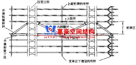 (3) 各樓層的重力荷載由5個不同高度上設置的“兩層高伸臂桁架”分別承受,5個部分相互獨立,從上至下分別懸掛著4層、5層、6層、7層和8層樓蓋。具體做法是在該桁架中部和兩端共懸吊3根吊桿,分別承受下部數(shù)層樓蓋的荷載,并將它們傳遞給巨型立柱。
