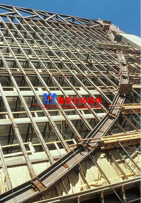 (3)全樓東西向的穩(wěn)定,由上述5個兩層高的桁架與格構柱形成框架來保證。南北向的穩(wěn)定,則要靠設置在中間5排的兩層高的交叉撐提供;它們與兩層高的桁架在同一標高上。此外,還有交叉撐位于第5~8層間的大廳中庭處。