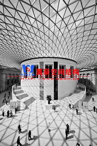 這個(gè)經(jīng)典的改造項(xiàng)目把輕與重巧妙組合。鋼結(jié)構(gòu)網(wǎng)殼內(nèi)側(cè)支承于圓形閱覽室,外側(cè)支承于方形博物館建筑的內(nèi)墻,通過(guò)找形分析得到一個(gè)拱起的規(guī)則形態(tài)。