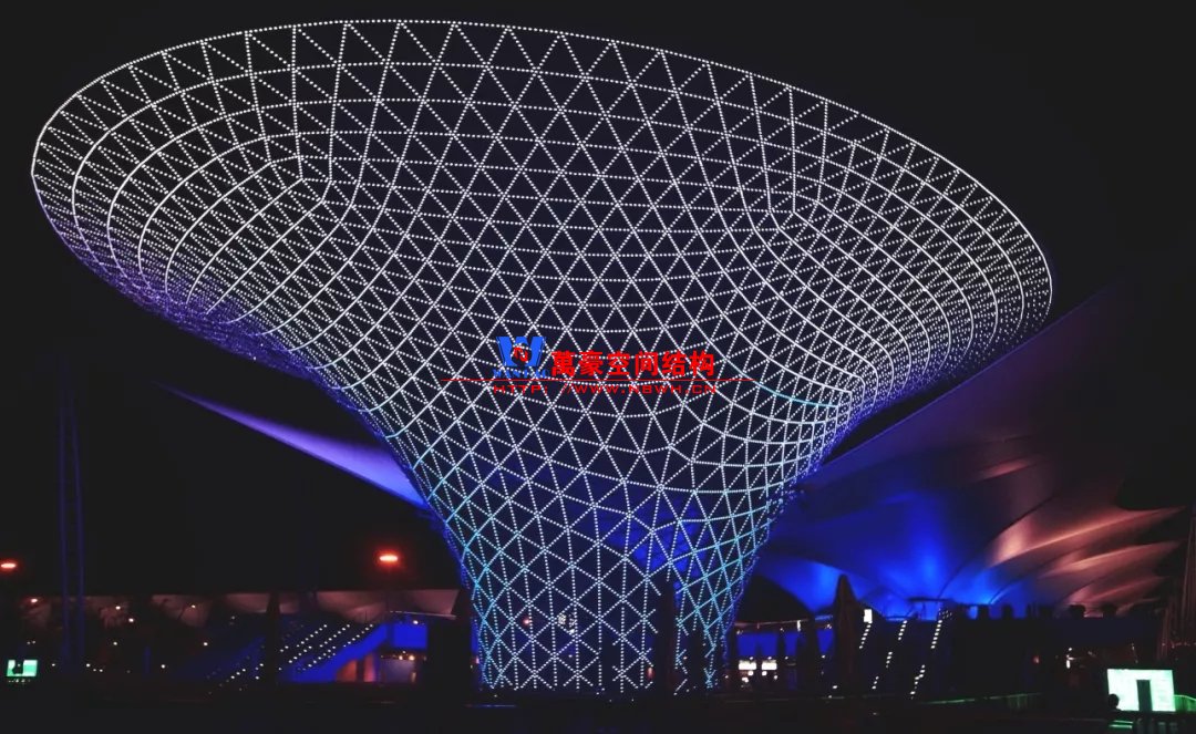 規(guī)則曲面的天幕一般采用鋼結(jié)構(gòu)網(wǎng)殼形式,利用網(wǎng)殼曲面的形抗原理,結(jié)構(gòu)以軸向受力為主、效率高,以較小的截面尺寸即可實(shí)現(xiàn)很大跨度。這一類網(wǎng)殼曲面多為圓柱面、球面。
