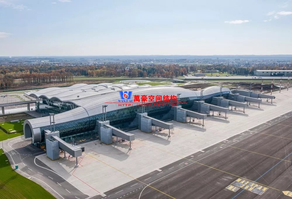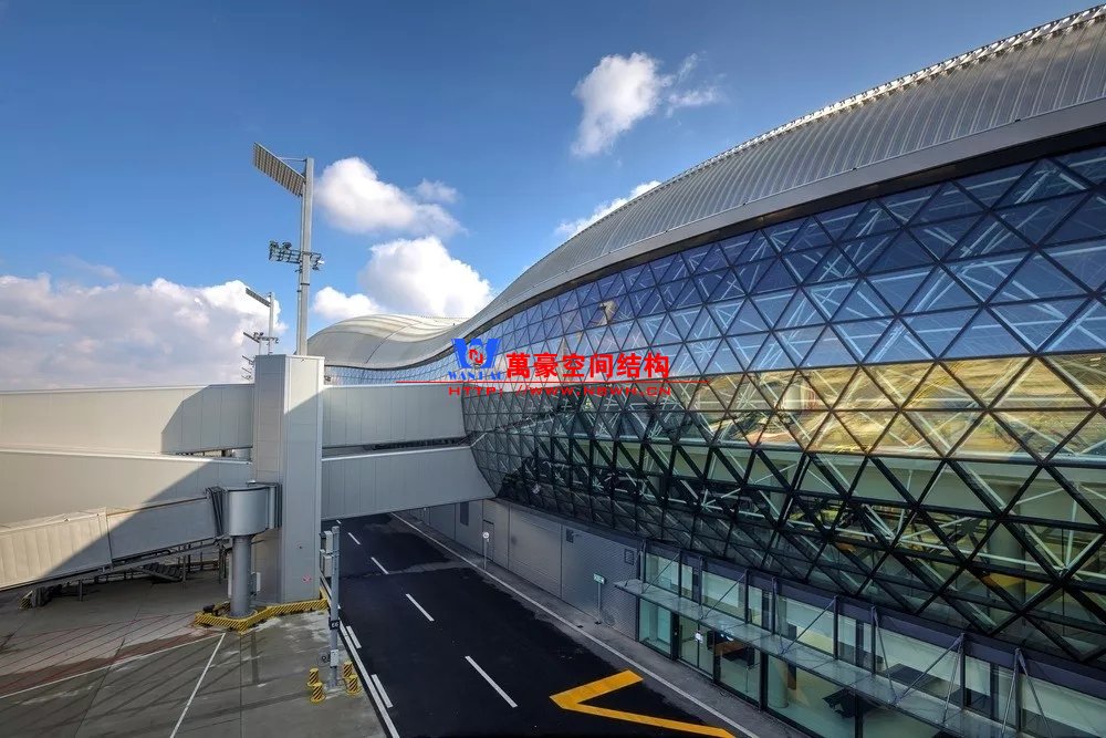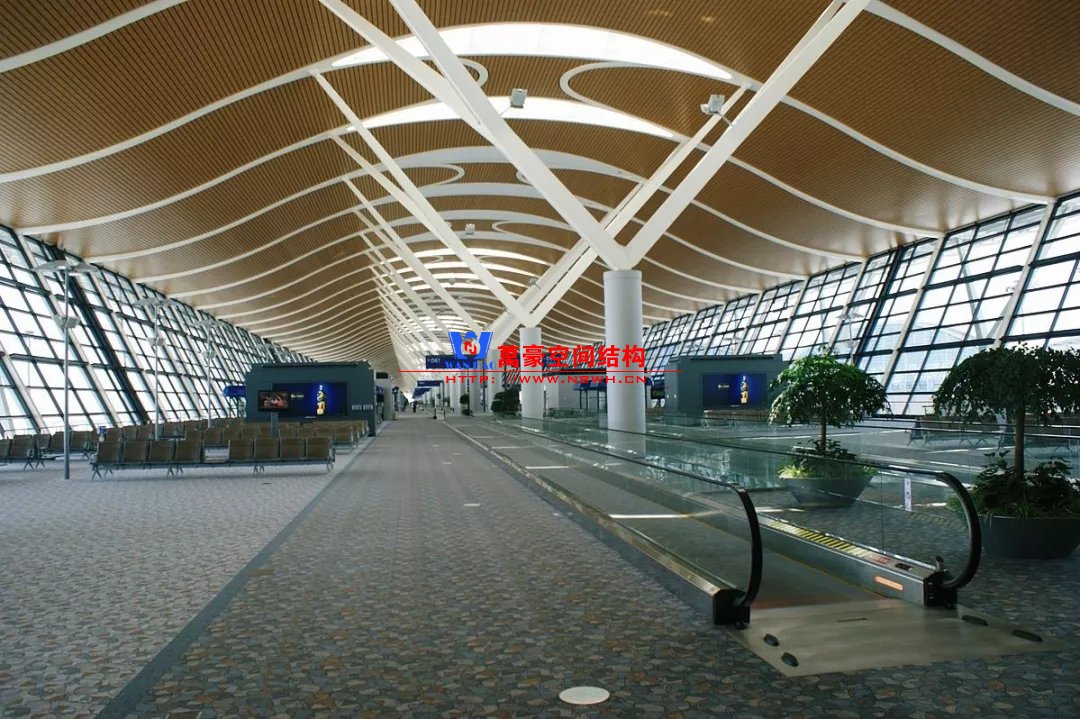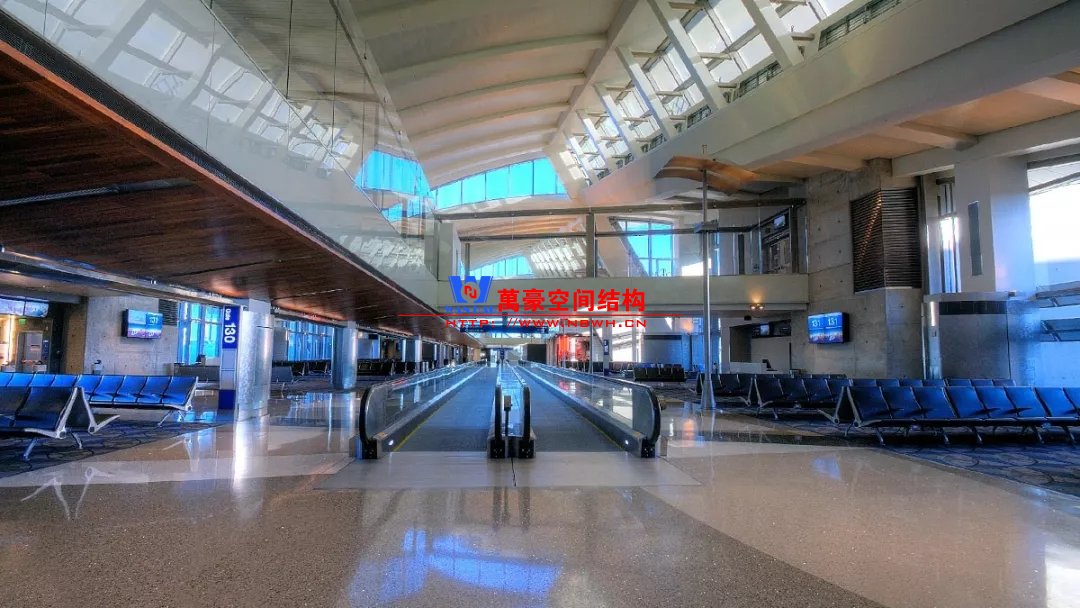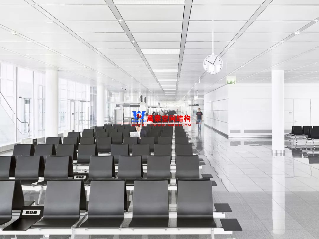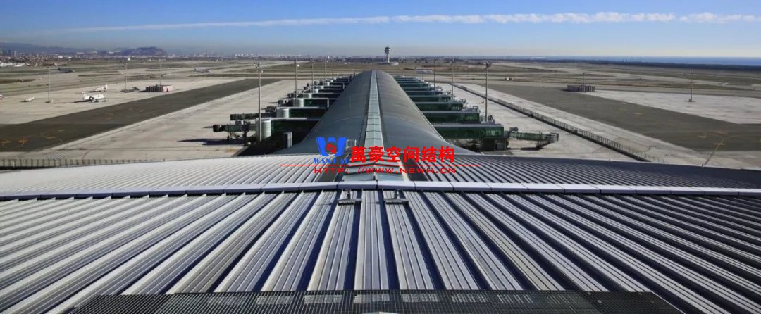 如巴塞羅那機(jī)場(chǎng)的指廊就是采用簡(jiǎn)單的鋼框架結(jié)構(gòu)體系,鋼柱布置于兩邊;幕墻采用剛性幕墻,貼近鋼柱外側(cè)布置;室內(nèi)吊頂無(wú)天窗,吊頂走向沿長(zhǎng)向,空間上有指向性。