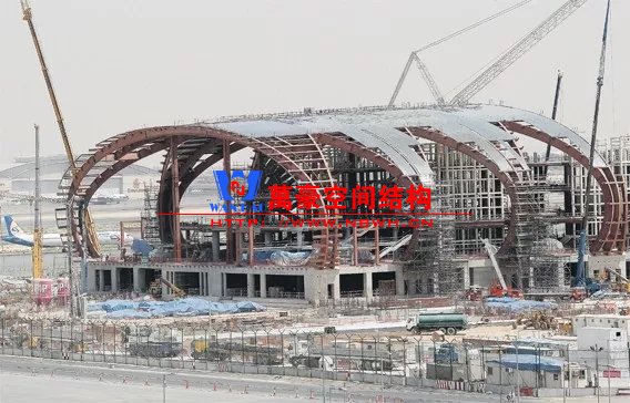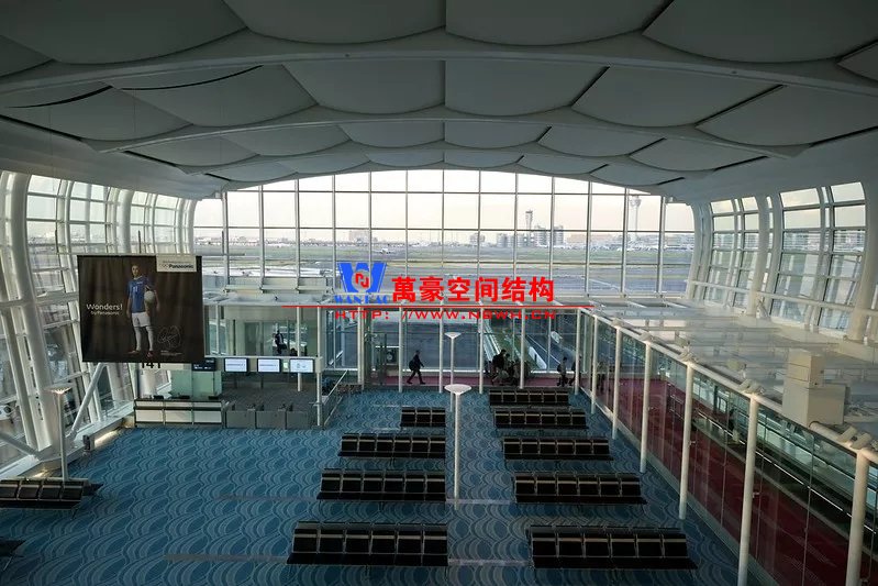 大阪關(guān)西機(jī)場(chǎng)則采用弧形鋼梁+索的結(jié)構(gòu)體系,有效減小了鋼梁尺寸,同時(shí)由于沒(méi)有天窗光線(xiàn)作用,鋼索并不明顯。可能是由于日本是地震多發(fā)地區(qū),外露的支撐構(gòu)件比較多略顯雜亂。