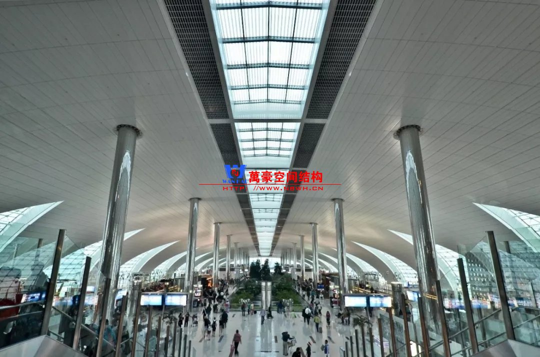 無(wú)獨(dú)有偶迪拜機(jī)場(chǎng)也是采用相似的外形,但是由于剖面并不是一個(gè)完整的拱形,因此構(gòu)件內(nèi)彎矩作用會(huì)比較明顯,因此在室內(nèi)布置了兩根柱子。立面幕墻則采用索桁架半剛性幕墻立面更加通透。與雙流機(jī)場(chǎng)不同,結(jié)構(gòu)構(gòu)件是吊頂外包的,因此外包區(qū)域采用了效率更高的主次梁體系。