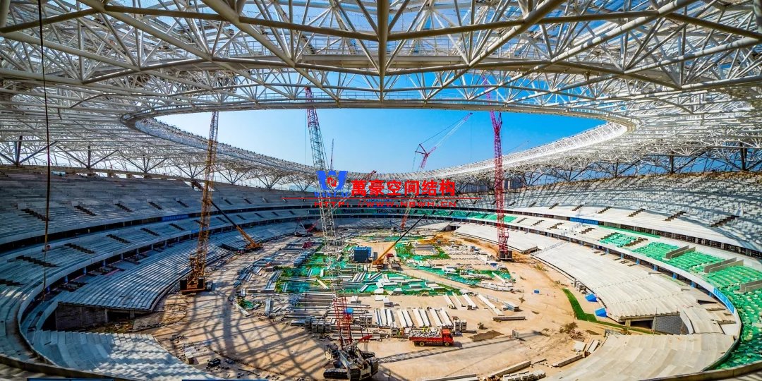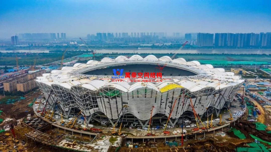 體育場(chǎng)罩棚整體造型呈馬鞍形,采用空間管桁架懸挑結(jié)構(gòu)體系,南北長(zhǎng)332m,東西寬316m,罩棚最高58.3m。2019年1月1日首吊,鋼結(jié)構(gòu)分包中建鋼構(gòu)歷時(shí)87天,消耗近5萬工日、逾5千機(jī)械臺(tái)班,完成168單元、9500噸罩棚鋼桁架吊裝工作,于3月28日提前合攏。