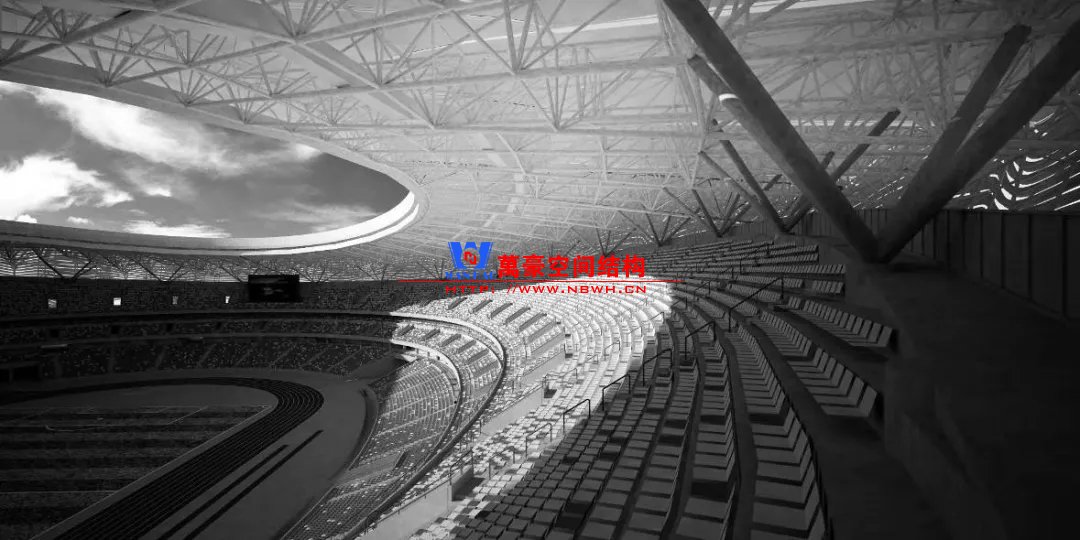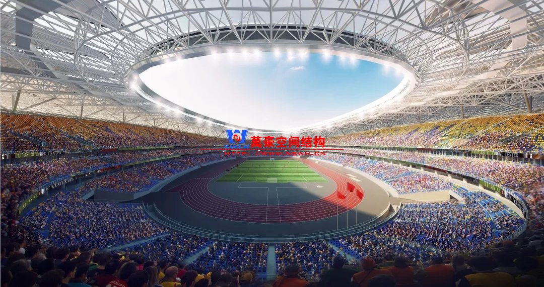 體育場(chǎng)主體建筑為南北長(zhǎng)332m、東西寬316m的橢圓形,鋼結(jié)構(gòu)罩棚最高處高58.3m,最低處高42.6m;中間開口南北長(zhǎng)200m、東西寬153m。主體鋼結(jié)構(gòu)采用空間懸挑鋼桁架結(jié)構(gòu),由28個(gè)V形柱支撐72片鋼結(jié)構(gòu)管桁架,整體東西高,南北低,呈馬鞍形,體育場(chǎng)看臺(tái)為框架-剪力墻體系。屋頂圍護(hù)結(jié)構(gòu)為鋁鎂錳直立鎖邊金屬屋面,罩棚立面采用銀白色穿孔鋁板幕墻系統(tǒng),通過有韻律的變化,表達(dá)了絲綢飄舞的動(dòng)感,輕盈通透的罩棚在夜晚能夠透出賽場(chǎng)內(nèi)熱烈的賽事氣氛,宛如皓月長(zhǎng)空下綻放的盛世之花。碗型看臺(tái)分為上、中、下三層座席,并在中上層看臺(tái)之間設(shè)置包廂層(包括66個(gè)大小包廂)及其座席區(qū),觀眾分別由各層看臺(tái)對(duì)應(yīng)的通道進(jìn)入。