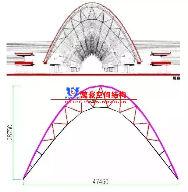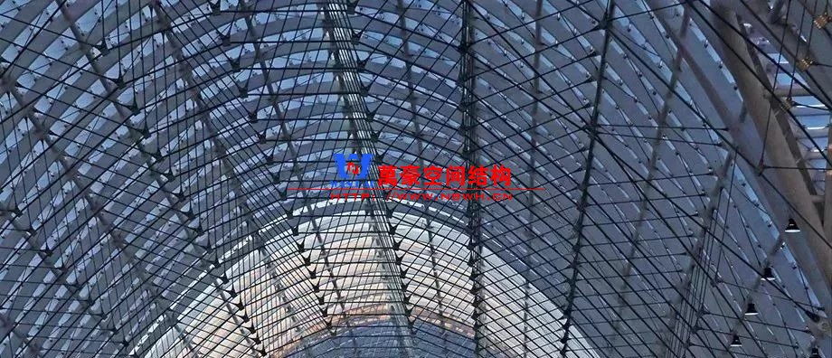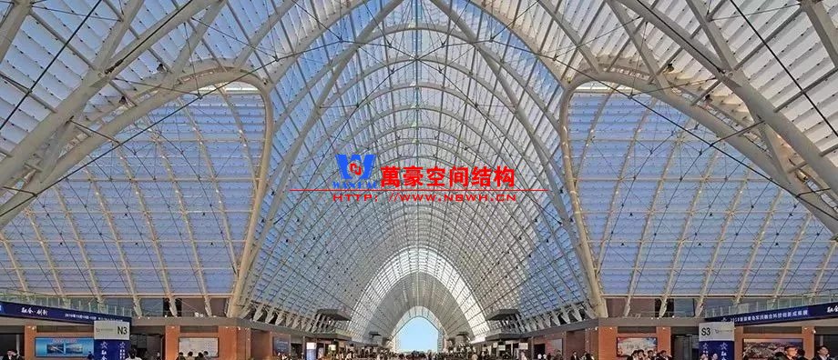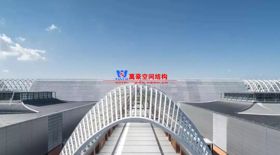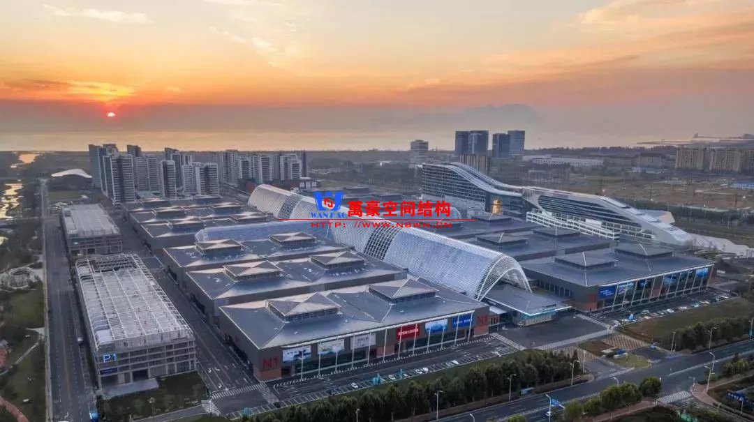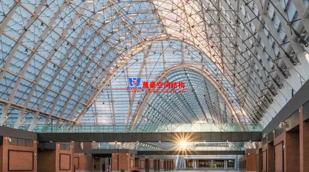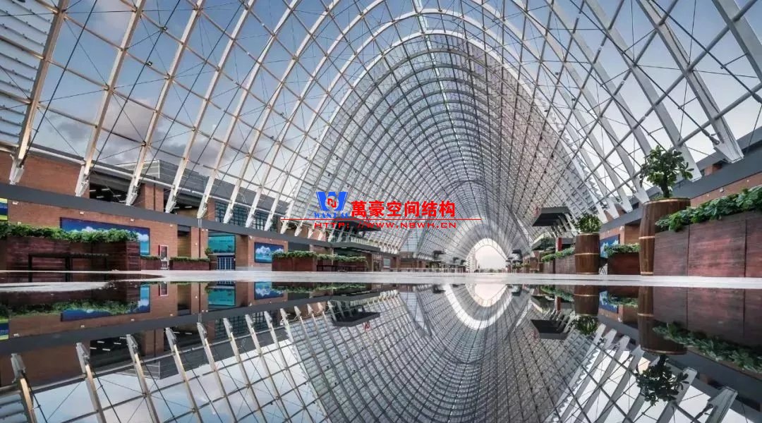 建筑內(nèi)在的空間結(jié)構(gòu)形成了外部形態(tài)的美學(xué)韻律和視覺沖擊力,使建筑形象真實而動人。包括展廊與展廳兩部分,以中央十字展廊為功能組織核心,南北各布置6個、共12個獨立展廳單元(尺寸74.4m×136.4m,采用變標(biāo)高的空間桁架鋼結(jié)構(gòu))。展廊平面呈十字型布置,東西向長507m,南北向長287m,主拱和次拱方向分別設(shè)置兩道溫度縫,最高點標(biāo)高為35.0m。