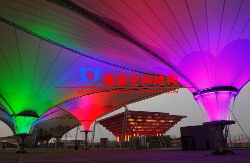 世博軸ptfe索膜結(jié)構(gòu)是迄今為止世界規(guī)模最大的連續(xù)張拉索膜結(jié)構(gòu),膜材選用了一種名為PTFE(聚四氟乙烯)的涂層玻璃纖維,具有不易燃性、防紫外線、抗風(fēng)化、自潔性、高反射性等特點(diǎn),完全可以適應(yīng)上海地區(qū)的臺(tái)風(fēng)氣候。陽(yáng)光谷ptfe索膜結(jié)構(gòu)只有在十級(jí)以上的風(fēng)力,才會(huì)出現(xiàn)明顯的位移,這個(gè)位移也在可以控制的范圍之內(nèi)。陽(yáng)光谷建筑負(fù)責(zé)人驕傲的告訴記者。上海世博會(huì)工程建設(shè)指揮部辦公室的市政項(xiàng)目部總經(jīng)理趙克平透露,張拉膜總面積約77224m2,最大跨度約97米,由31個(gè)外側(cè)桅桿,19個(gè)下拉點(diǎn)以及18個(gè)與陽(yáng)光谷的拉接點(diǎn)通過(guò)13種不同功能索張拉而成,膜片數(shù)量69片,其中最大的膜單片面積達(dá)1780m2。