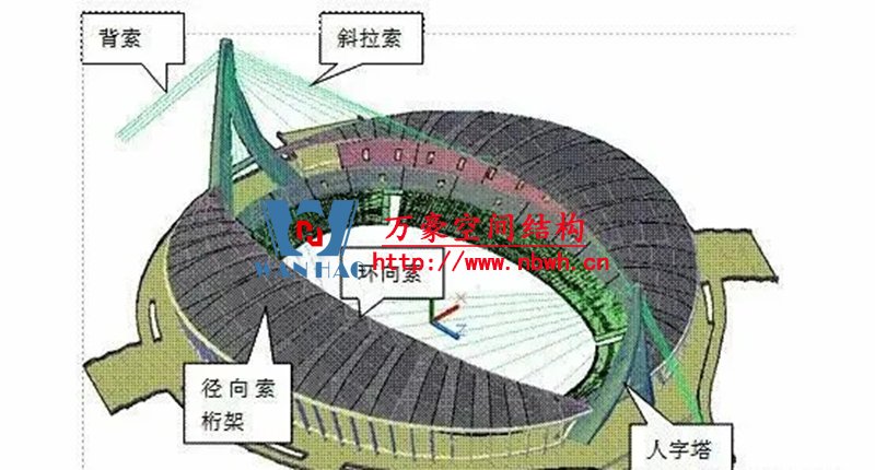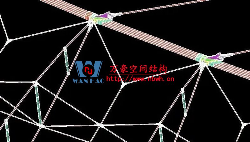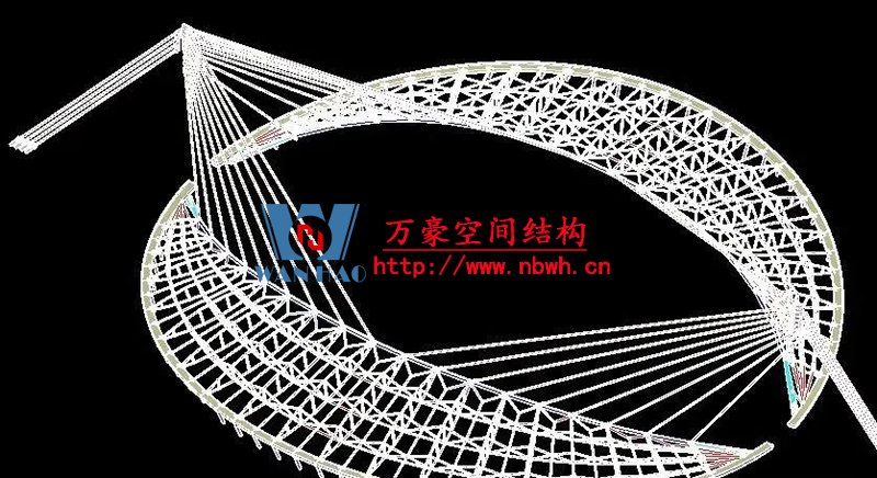 1、整個索網(wǎng)、環(huán)梁和吊塔形成整體受力體系,結(jié)構(gòu)受力傳遞路徑復(fù)雜;