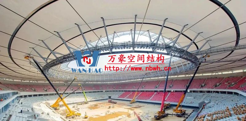 球場的屋蓋采用了預應力輪輻狀張拉體系,就像一個自行車的輪轂橫著蓋在了球場上方,最大特點是用鋼結構和索網結合,取代了以往比較沉重、繁瑣的鋼桁架體系,最大的好處就是輕量化,整個屋蓋的用鋼量在4600噸左右,相比以往傳統(tǒng)的建造方式,在用鋼量上大約減少了50%。