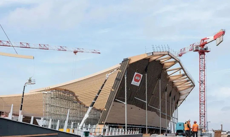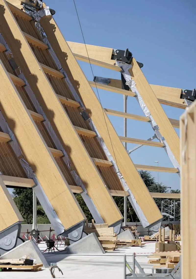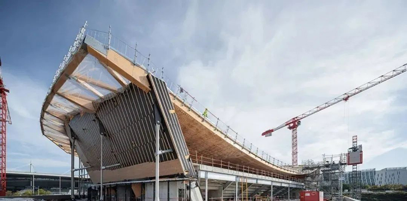 木材是典型的生物基建筑材料之一,是該建筑的主要結(jié)構(gòu)材料。因為木材比其他材料(如混凝土和鋼材)所產(chǎn)生的二氧化碳排放量更少,正好迎合巴黎舉辦歷史上最可持續(xù)的運動會的目標。通過在這個巨大的結(jié)構(gòu)中使用木材,該方案將生物材料的使用比例提高了一倍。