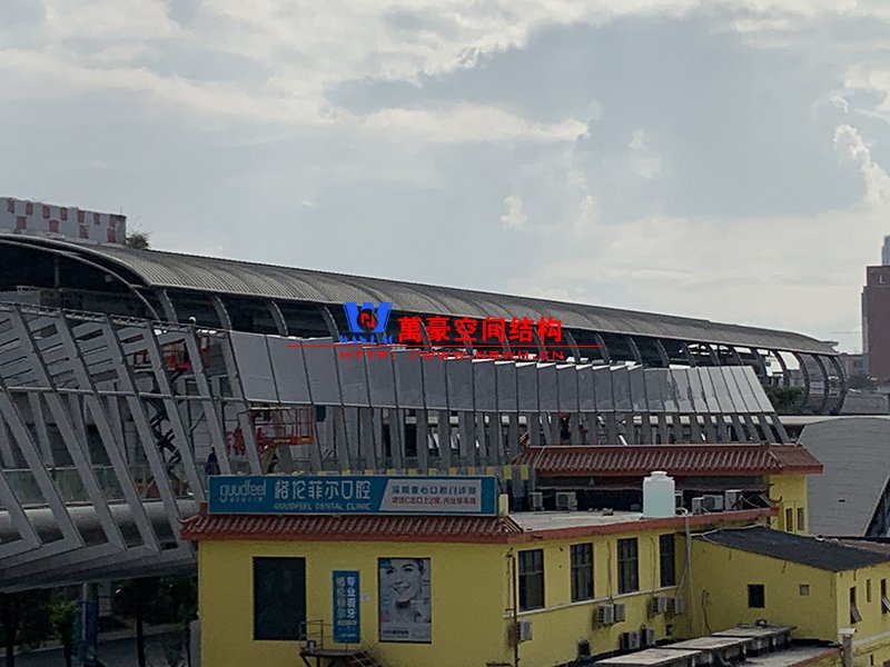 深圳龍崗三館一城項目市政配套工程1號連廊膜結構工程項目為單層ETFE膜結構,共劃分為101個單元,總面積約為2000㎡,由寧波萬豪空間結構工程有限公司承建。膜結構原材采用德國NOWOFOL-300μm鍍點ETFE材料,保證透光率的同時,兼顧防范紫外線。膜結構四周利用鋁合金夾具固定于主鋼結構二次構件上,膜面采用PE鋼索輔助支撐,確保膜面有效承擔相應動荷載。