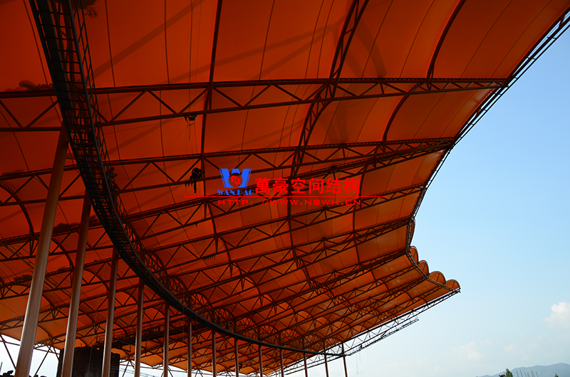 夢(mèng)幻谷“暴雨山洪”看臺(tái)為骨架支承式膜結(jié)構(gòu)。骨架鋼結(jié)構(gòu)由15榀主桁架和154根弧管組成,采用圓鋼管制作。