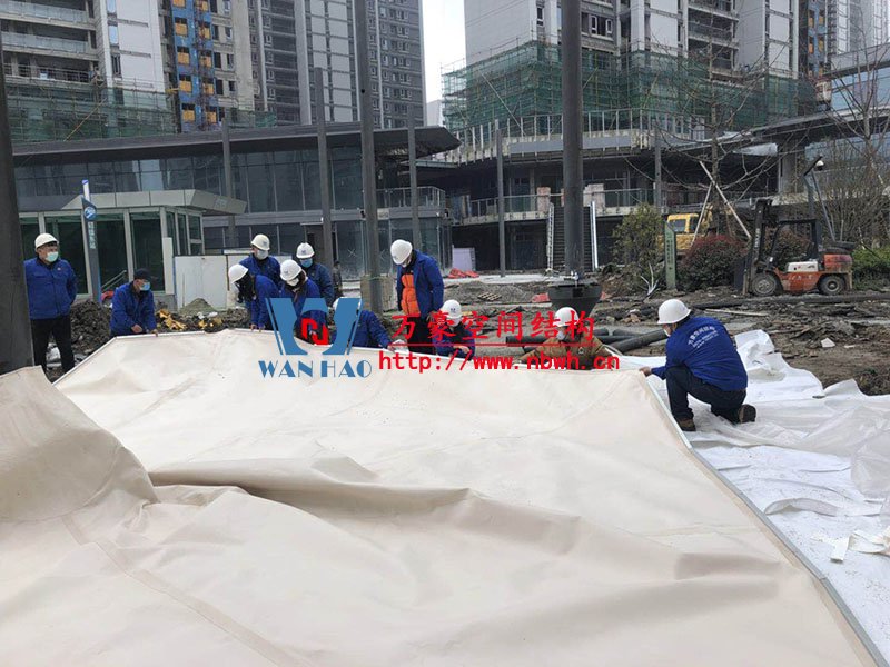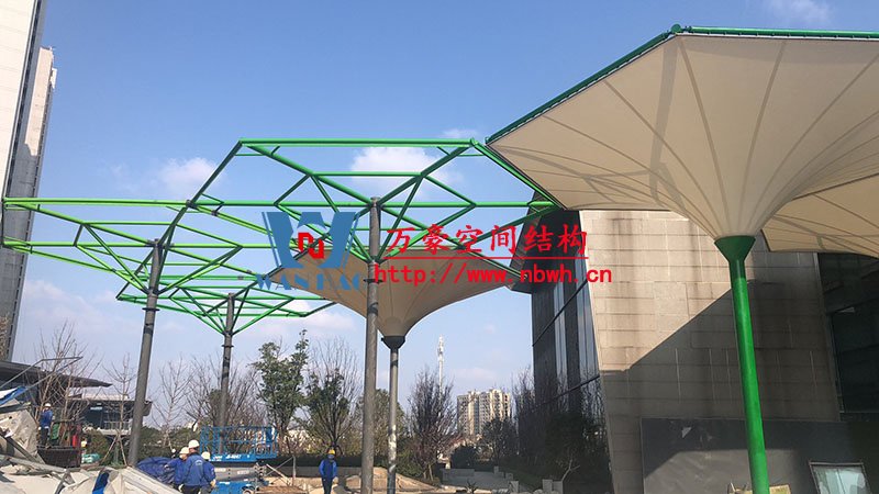 五鄉(xiāng)地鐵站傘狀PTFE膜結(jié)構(gòu)項目位于浙江省寧波市楊柳郡,項目由19座倒傘膜結(jié)構(gòu)組成,倒傘寓意盛開的牽牛花。該項目膜材使用進口PTFE膜材,膜結(jié)構(gòu)展開面積5000平米,用鋼量100噸,由寧波萬豪空間結(jié)構(gòu)工程有限公司承建。