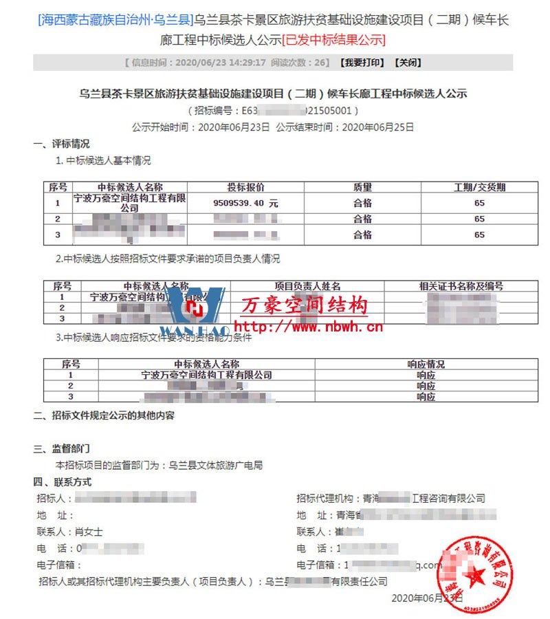 喜訊?。?! 祝賀我司中標烏蘭縣茶卡景區(qū)旅游扶貧基礎設施項目(二期)膜結(jié)構(gòu)工程。 該項目位于青海省海西蒙古族藏族自治州烏蘭縣茶卡景區(qū),工程用鋼量200噸,膜結(jié)構(gòu)展開面積6000平米,建成后將成為當?shù)亓硪坏貥诵越ㄖ?/span> 這是萬豪2020年的第8標,萬豪定當再接再厲,完美完成此次工程,大家拭目以待。