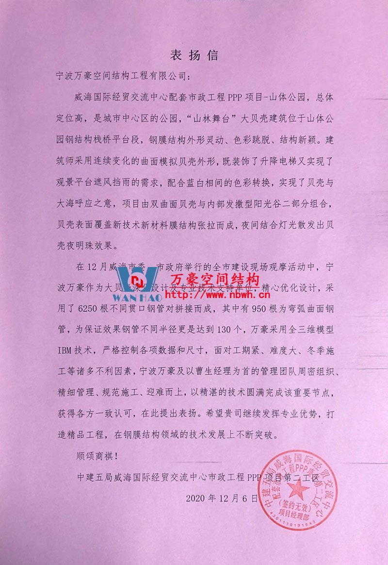 特此中建五局威海國際經(jīng)貿(mào)交流中心項(xiàng)目部致以感謝信與定制錦旗給與嘉獎(jiǎng)。