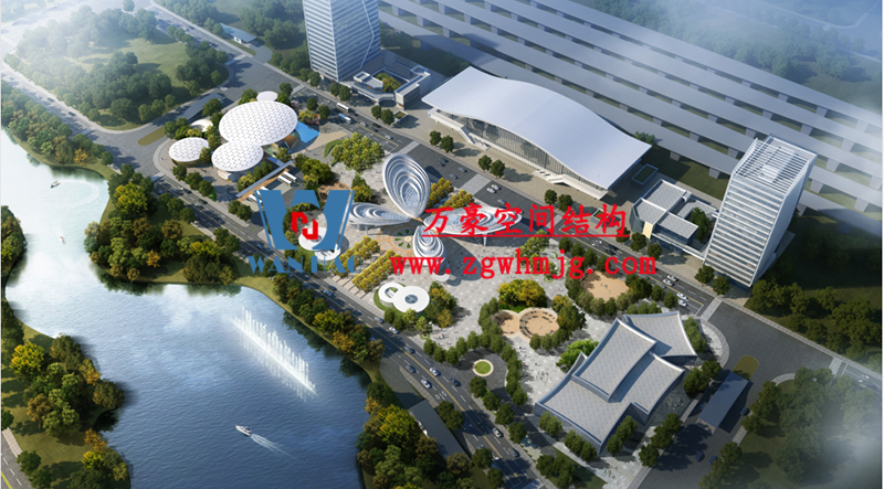 本工程鋼結(jié)構(gòu)為單層雙曲網(wǎng)殼結(jié)構(gòu)體系,平面上為對稱結(jié)構(gòu),大翅膀長跨約 50m,短跨約 25m,小翅膀長跨約 35m,短跨方向約 15m。建筑頂面為雙曲造型,建筑物最高點標高約17米??傆娩摿?00噸,膜體總面積約7000平方米。