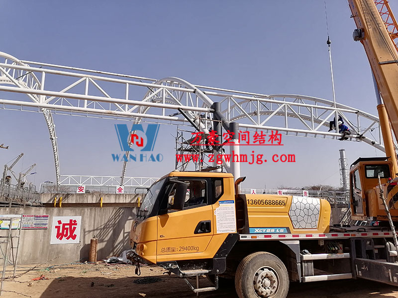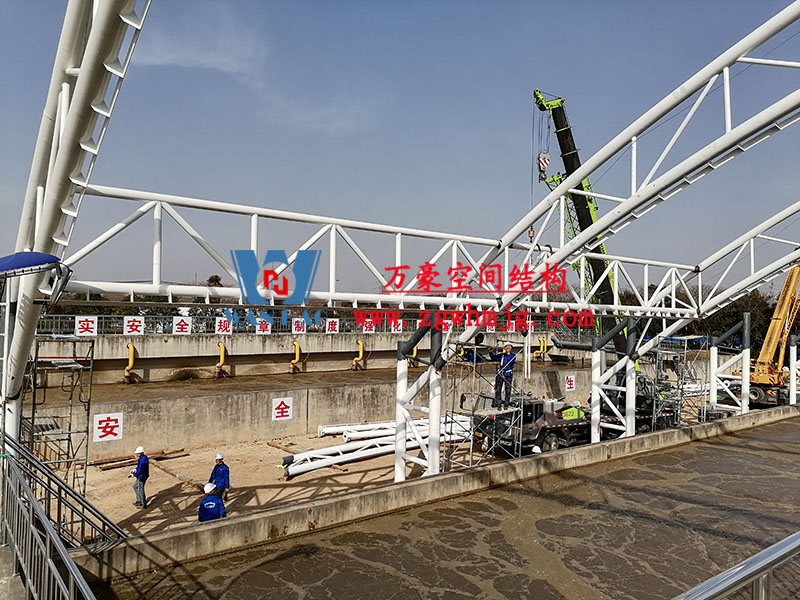 目前,進水口、粗格柵、細格柵、厭氧池兩個池子鋼結構都已完成 ,厭氧池立面膜已張拉,開始裝側面膜,南區(qū)氧化溝三個主桁架完成 ,準備進行下一步施工。