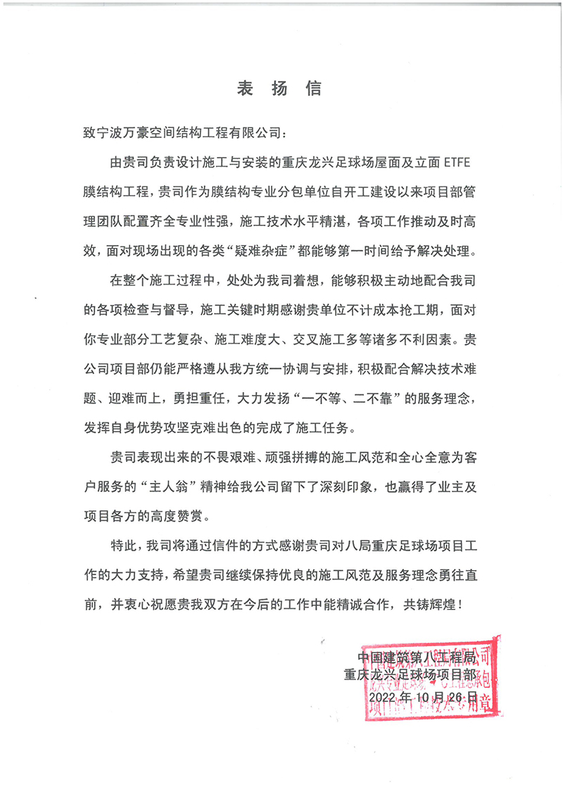 特此,中國(guó)建筑第八工程局重慶龍興足球場(chǎng)項(xiàng)目部致以定制錦旗與感謝信給與嘉獎(jiǎng)。