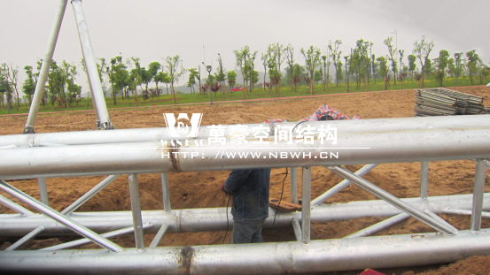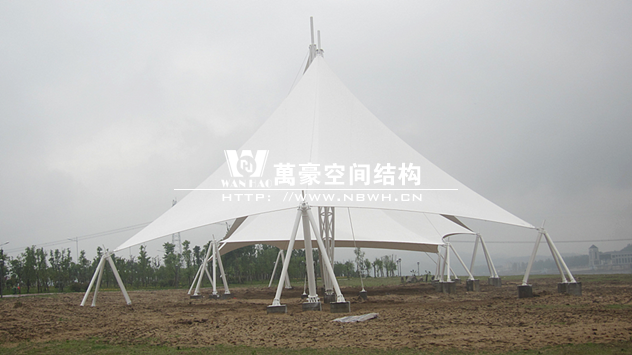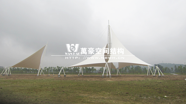 本景觀膜結(jié)構(gòu)安全等級為二級,膜材選用意大利進口雙面PVDF超自潔涂層膜材,鋼結(jié)構(gòu)設(shè)計使用年限25年。張拉膜近2千㎡、高度26.88米,總用鋼量約為57.69噸。桁架、鋼管材質(zhì)均為Q345B鋼,相貫焊接。所有鋼構(gòu)件熱鍍鋅處理,運輸、安裝過程中對涂層的損傷,須視損傷程度的不同釆取相應(yīng)的修補方式,對拼裝焊接的部位必須清除焊渣,進行表面處理達到St3級要求后,涂刷環(huán)氧無機富鋅底漆+環(huán)氧云鐵中間漆+氟碳面漆。