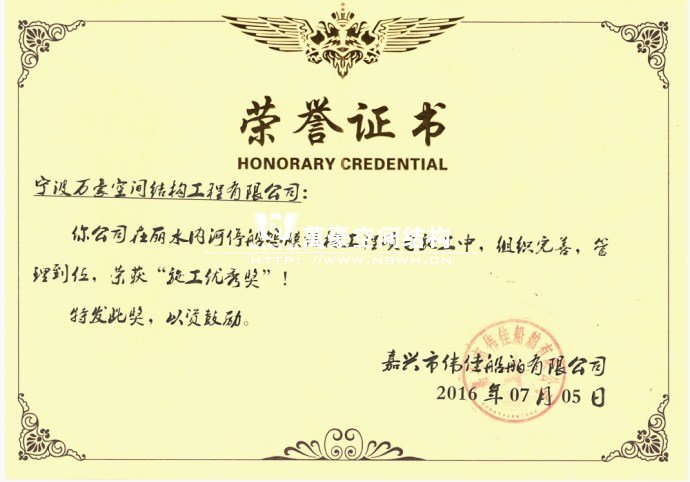 我司承建的浙江麗水內(nèi)河停船塢膜結(jié)構(gòu)工程項(xiàng)目獲得業(yè)主頒發(fā)“施工優(yōu)秀獎(jiǎng)”。
