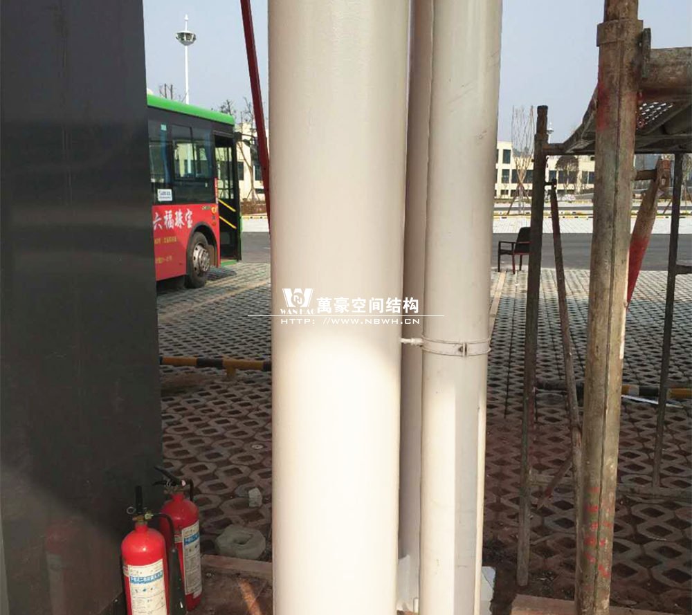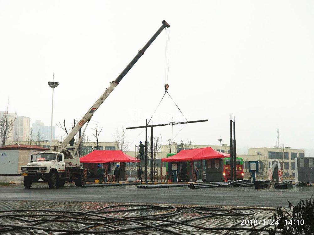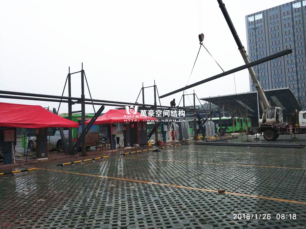 而本工程位于岳池火車站的對面的客運中心,是比亞迪公交車充電樁的附屬設施。工程總用鋼量達8噸,膜材面積400平方米,以雙挑的形式為現(xiàn)場的充電樁遮陽擋雨。