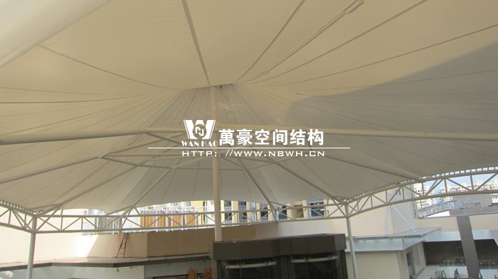 本工程總建筑面積約900平方米,主體一根主柱、九根支柱,四周單片桁架連接,總體一個(gè)帽柱,直線長(zhǎng)為26.9米,帽柱總高33.6米,寬為27.8米。因?yàn)楸竟こ套湓谏虡I(yè)區(qū)中心,四周都是五層商鋪,吊車無法進(jìn)入施工現(xiàn)場(chǎng),先用25噸吊車把材料送到五層樓房頂,后用人工或手拉葫蘆進(jìn)行運(yùn)送和安裝。施工范圍包括鋼結(jié)構(gòu)系統(tǒng)與膜材系統(tǒng)的制作和現(xiàn)場(chǎng)安裝施工,現(xiàn)工程已經(jīng)完工。